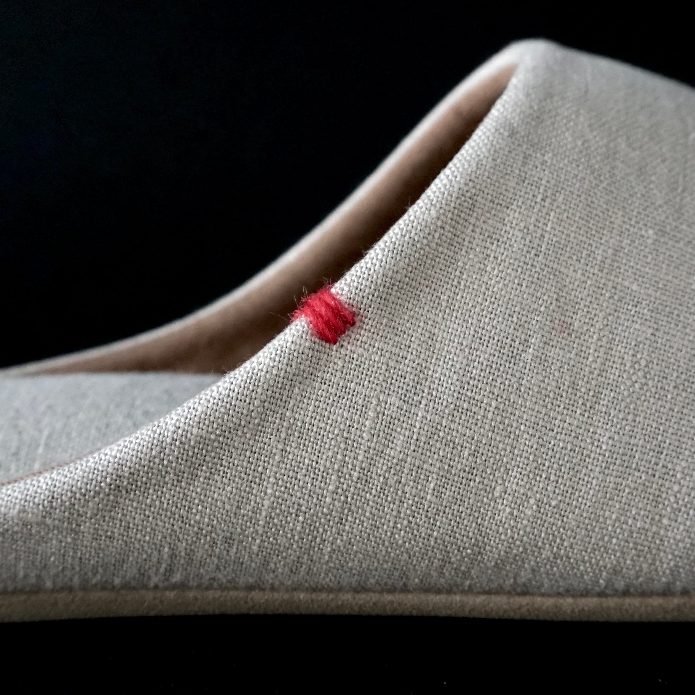 左右のあるホームシューズのため、紅花染のアクセントを外側にするとスムーズにご使用いただけます。
