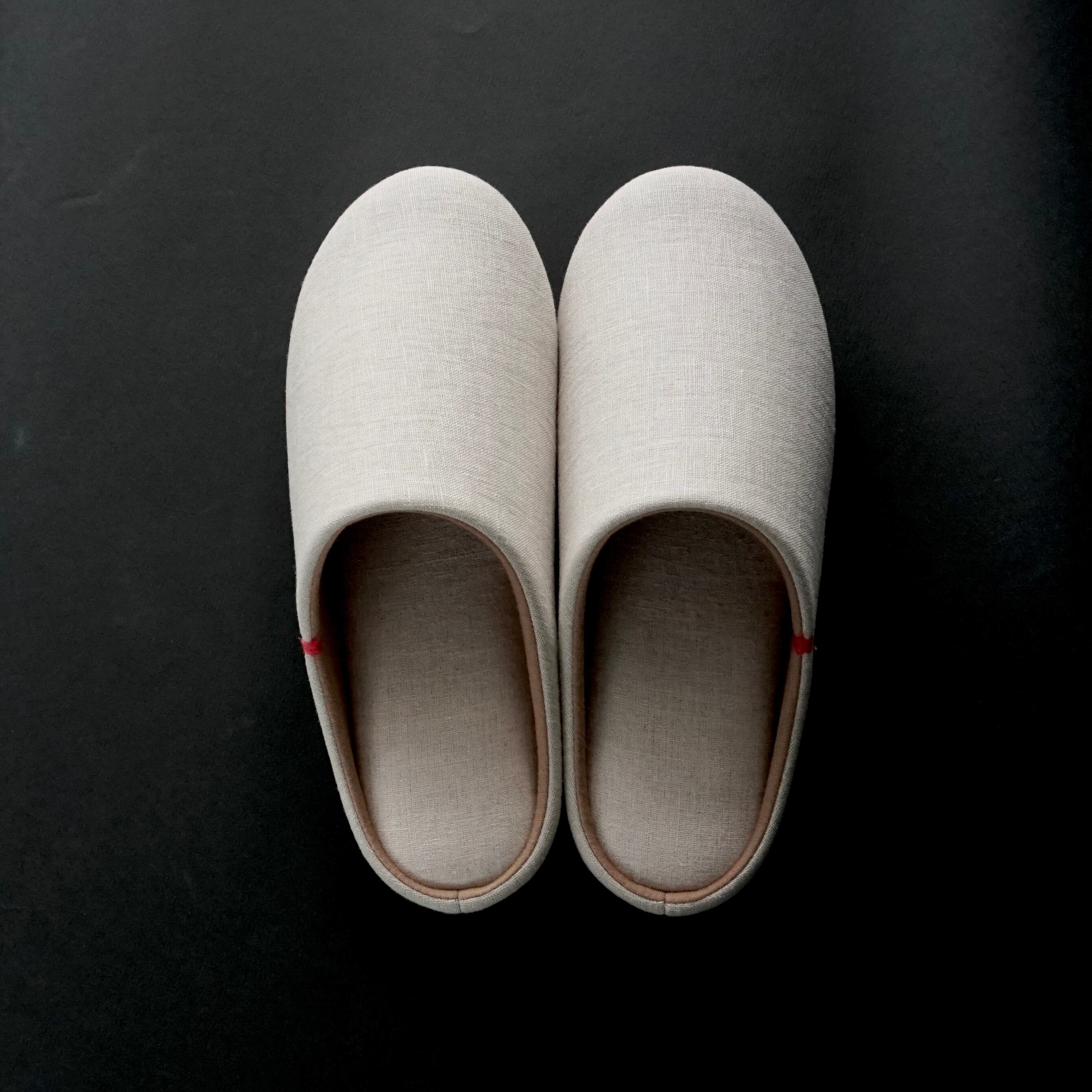 左右のあるホームシューズのため、紅花染のアクセントを外側にするとスムーズにご使用いただけます。
